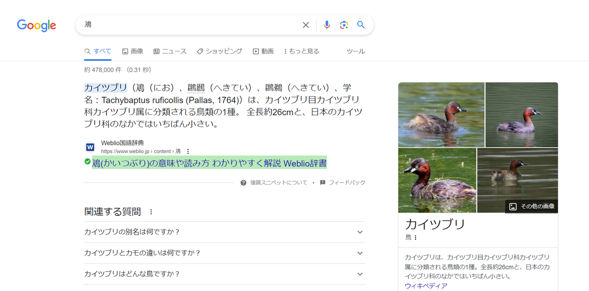 得られた言葉は、「七宝焼き」「手」「実力」「カイツブリ」「戦没者」でした。